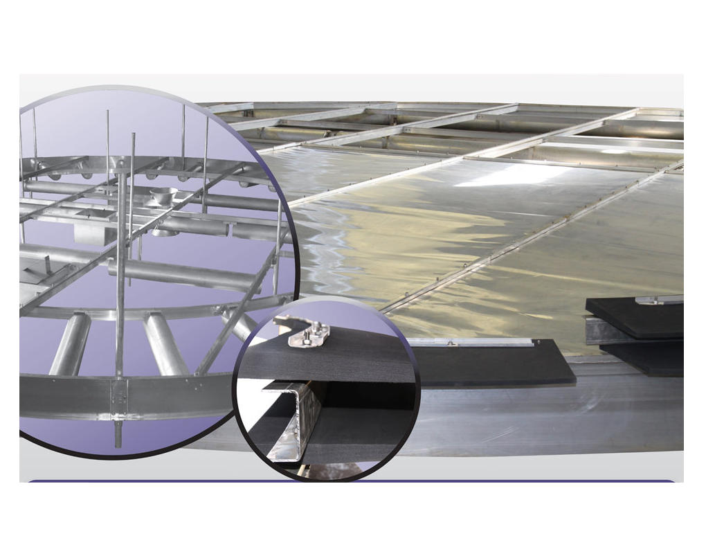 The even distribution of pontoons on the peripheral ring reduces friction between the tank shell and the